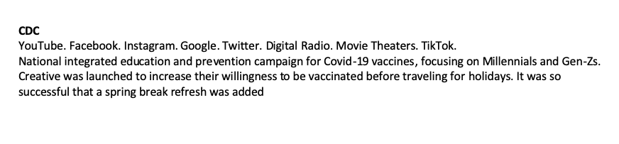 Clients: CDC, AARP, AdCouncil, Partnership for Drug Free America, Africa Foundation, among others.